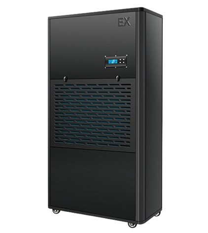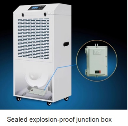 Industrial Dehumidifier MODEL DDH – BCF with explosion-proof system, designed specifically for areas at risk of ignition. Safely reduces humidity in chemical rooms, paint booths, and armories. Available in 8 models with capacity of 56-480 liters/day.